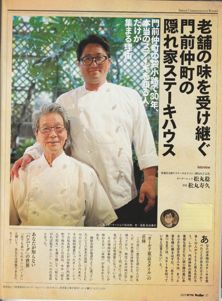 勝新太郎が毎週のように通っていたという六本木の伝説「STEAKHOUSE CHACO六本木」。その総料理長だったオーナーシェフの松丸稔さんが30年前に門前仲町で始めたこの店は、今や「知る人ぞ知る」を通り越して「知らなければ恥ずかしい」レベルの名店となった。