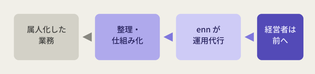 ennが提供しているのは、単なる業務の肩代わりではありません。属人化した業務を整理し、誰でも動かせる仕組みに落とし込む。そのうえで、日々の実務を担うことで、経営者の手から「回す仕事」を切り離す——これが私たちのアプローチです。